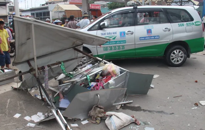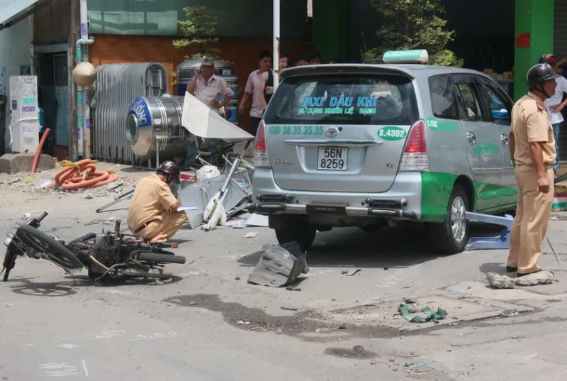 Lực tông mạnh khiến phương tiện lao thẳng vào xe buýt BKS 53N – 3340 ở phía trước. Tiếp đó, taxi tông mạnh vào xe gắn máy và tông văng chiếc xe bán thuốc lá đang đậu ven đường. Sau đó chiếc tãi mới dừng lại.