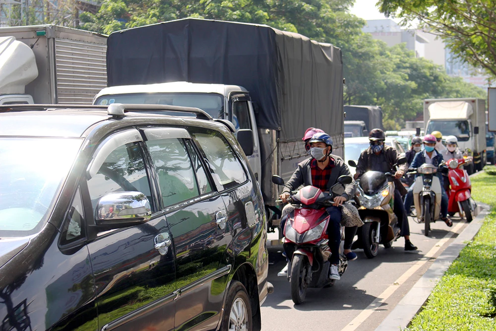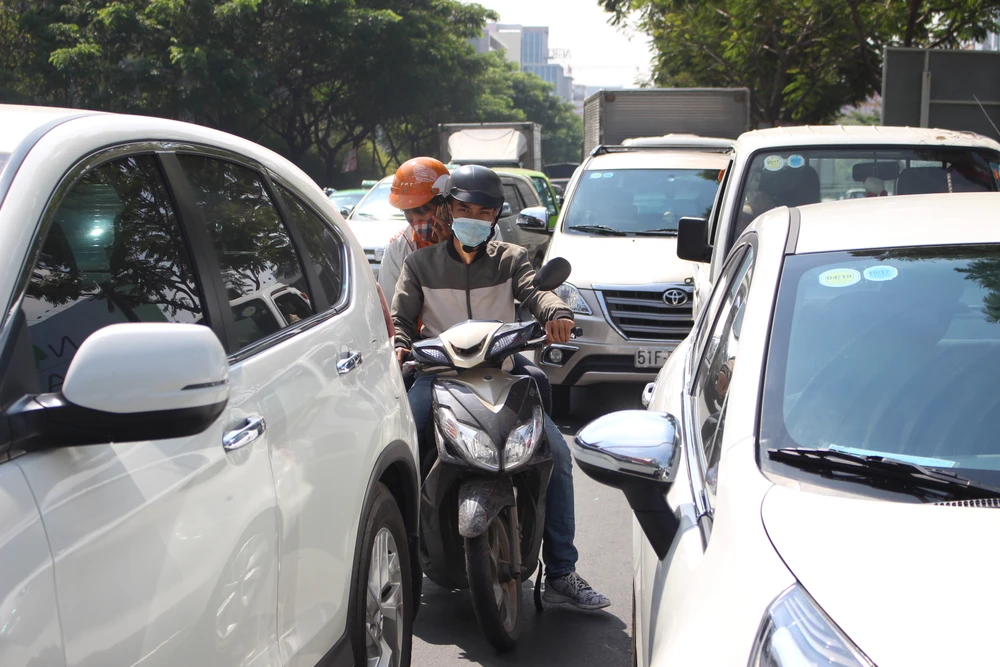Xe máy len lỏi giữa các xe ô tô trên đường Trường Sơn