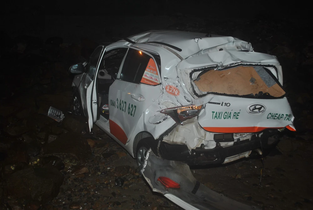 Chiếc taxi bay xa hàng chục mét rồi lao xuống bãi đá. Ảnh do công an cung cấp