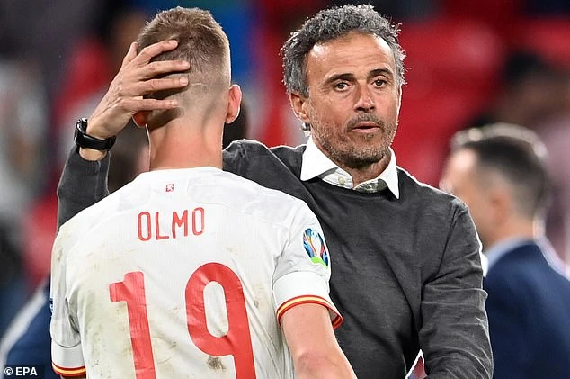 Enrique an ủi học trò Olmo, người đá hỏng quả penalty đầu tiên trong loạt luân lưu. ẢNH: EPA