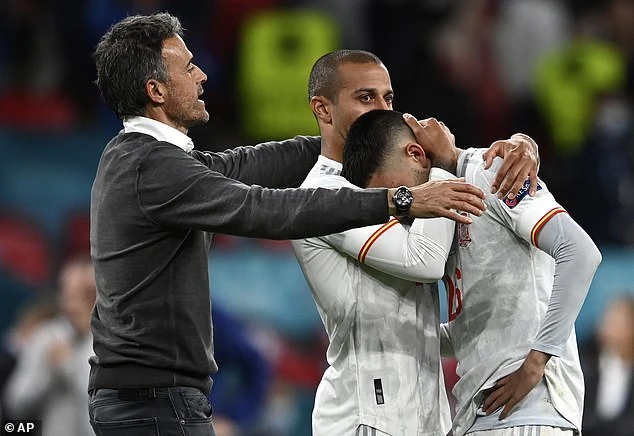 Enrique và Thiago Alcantara an ủi Pedri. ẢNH: AP