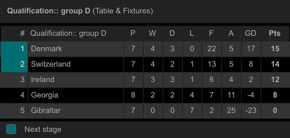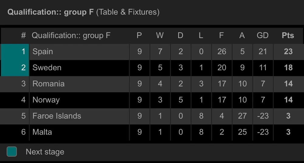 Giành chiến thắng tưng bừng 7-0 trước Malta, Tây Ban Nha tiếp tục cầm chắc ngôi đầu với 23 điểm sau chín vòng đấu. Ở hai trận đấu còn lại của bảng F, Thụy Điển thắng Romania 2-0 để chiếm vị trí nhì bảng với 18 điểm, Na Uy thắng Faroe Islands với tỉ số 4-0.