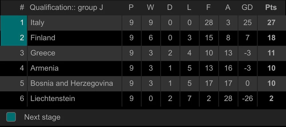 Sang hiệp hai, tiền vệ Nicolo Barella có đường chọc khe xé toang hàng thủ của chủ nhà. Tiền đạo Andrea Belotti một mình chạy chỗ xâm nhập vòng cấm rồi dứt điểm tự tin giúp tuyển Ý giành chiến thắng với tỉ số 3-0. Đánh bại Bosina and Herzegovina, tuyển Ý nắm chắc ngôi đầu bảng J với 27 điểm tuyệt đối sau 9 vòng đấu. Hai trận đấu còn lại của bảng J, Phần Lan thắng Liechtenstein 3-0 để có được ngôi nhì bảng với 18 điểm. Hy Lạp thắng Armenia với tỉ số 1-0.