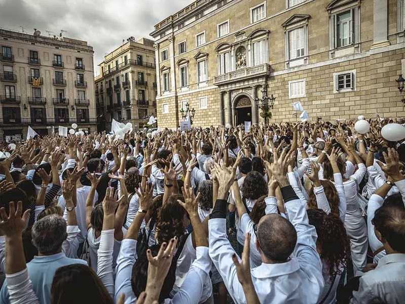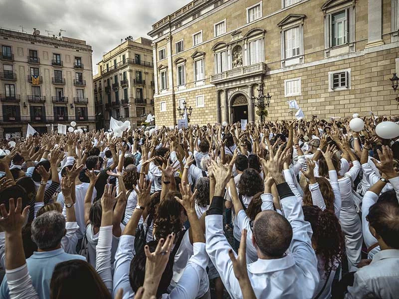 Những người tham gia “biểu tình trắng” kêu gọi đối thoại và hòa giải tại quảng trường Sant Jaume, Barcelona. Ảnh: SHUTTERSTOCK