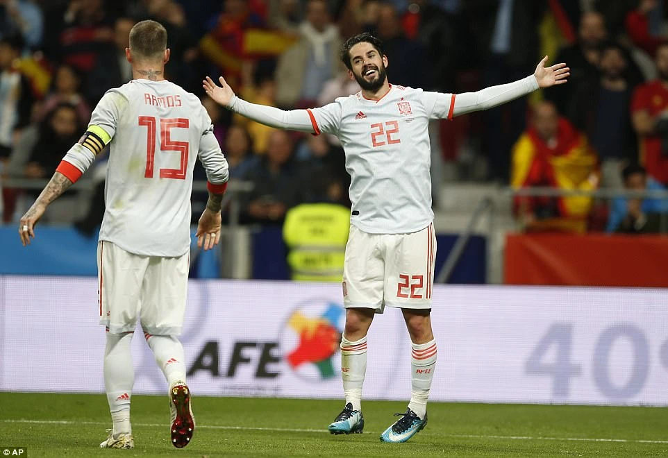 Tây Ban Nha: De Gea; Carvajal, Pique (Azpilicueta 72), Ramos, Alba (Alonso 79); Koke, Thiago (Parejo 82), Iniesta (Niguez 56); Isco (Lucas 76), Costa (Aspas 45), Asensio