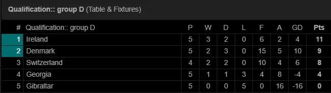 Như vậy, sau năm lượt trận tại bảng D, Ireland đang dẫn đầu bảng có 11 điểm, Đan Mạch đứng thứ hai với 9 điểm, Thụy Sĩ xếp thứ ba có 8 điểm nhưng mới chỉ thi đấu bốn trận. Đây sẽ là ba đối thủ cạnh tranh trực tiếp cho hai chiếc vé chính thức tham dự VCK Euro 2020 tại bảng này.
