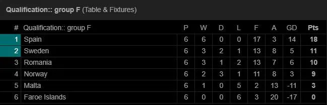 Trong khi đó, đối thủ cạnh tranh trực tiếp của Tây Ban Nha là Thụy Điển bị Na Uy cầm hòa 1-1. Kết quả này giúp Tây Ban Nha vững chắc trên ngôi đầu bảng với 18 điểm tuyệt đối sau sáu lượt trận. Thụy Điển vẫn giữ được vị trí nhì bảng với 11 điểm, kém Tây Ban Nha đến 7 điểm. Theo sát Thụy Điển là Romania và Na Uy lần lượt có 10 và 9 điểm.