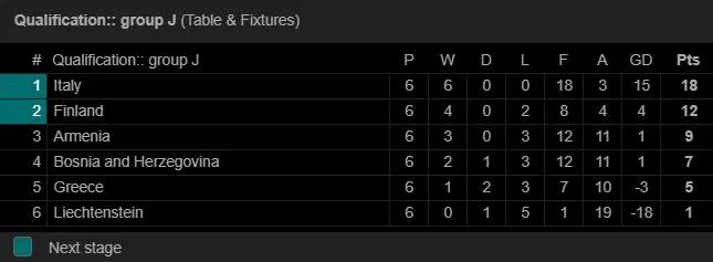 Sau sáu lượt trận ở bảng J, tuyển Ý dẫn đầu bảng với 18 điểm tuyệt đối. Phần Lan đứng thứ hai với 12 điểm, Armenia có 9 điểm đứng thứ ba, Bosnia and Herzegovina đứng thứ tư với 7 điểm, trong khi đó Hy Lạp mới có 5 điểm, cuối bảng là Liechtenstein chỉ có đúng 1 điểm.
