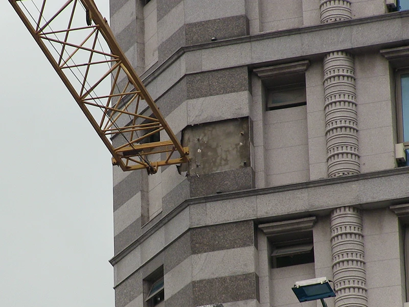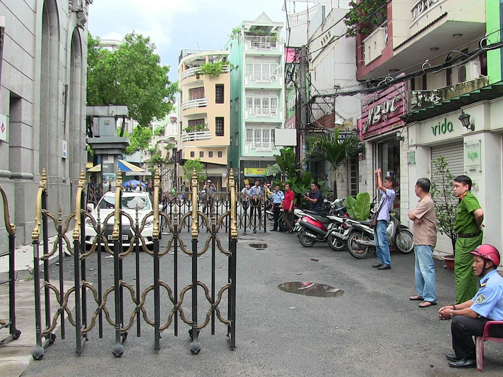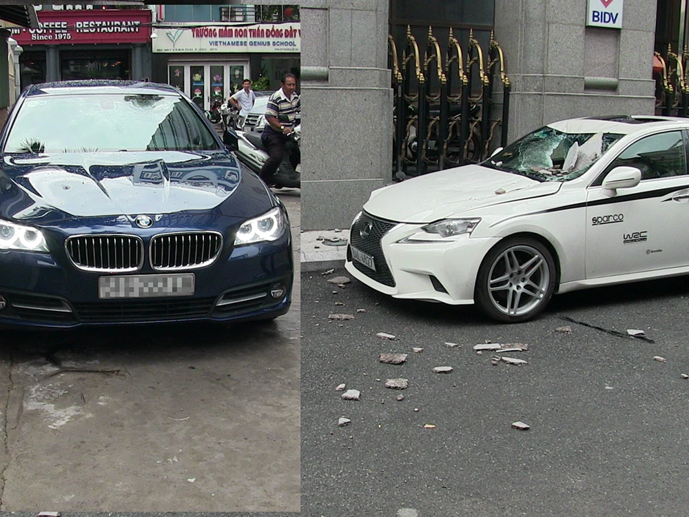 Tại hiện trường, nhiều mảnh đá lát tường văng tung tóe khắp nơi cạnh hai ô tô bị vỡ nát kính chắn gió, trong đó ô tô Lexus bị hư hỏng nặng, nắp capô bị bật tung. Phía trên, một phiến đá lát tường ở tầng sáu tòa nhà ngân hàng bị bong ra từ độ cao khoảng 20 m.