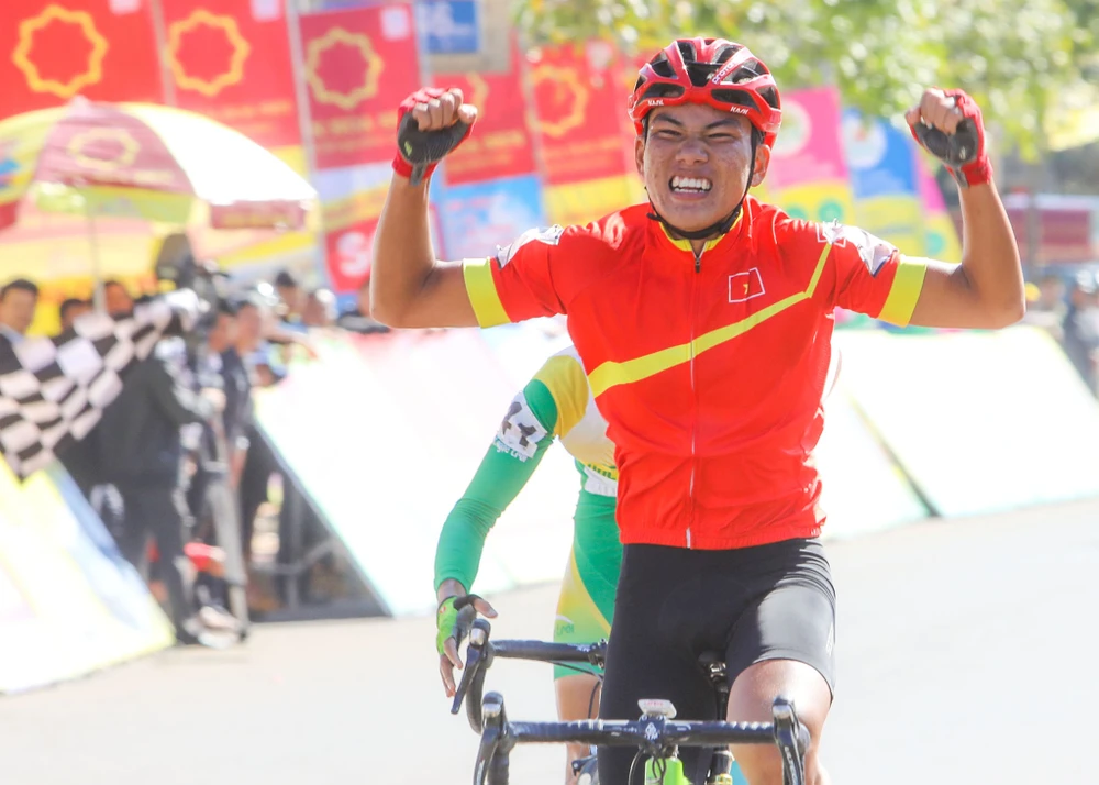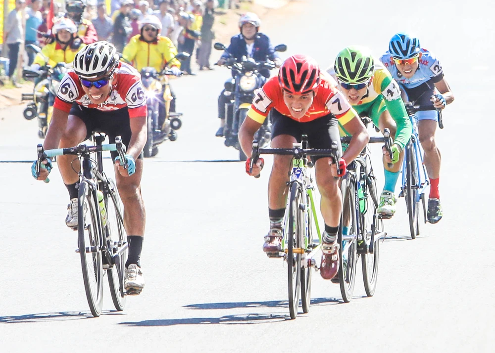 Tay đua trẻ Nguyễn Anh Khoa (7) tung nước rút tại mức đến Gia Nghĩa.
