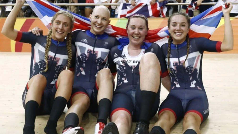Elinor Barker (phải) cùng các đồng đội ăn mừng chiếc HCV Olympic 2016. Ảnh: REUTERS