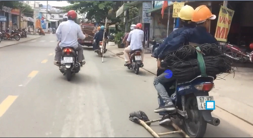 Theo clip của một người đi đường ghi lại, hai người thợ đi chung một chiếc xe máy, chở theo những bó cáp rất cồng kềnh. Dễ sợ hơn, người cầm lái còn thò chân xuống đường… kéo lê theo một chiếc thang tre dài đến vài mét.