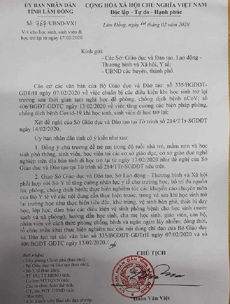 Theo đó, ngày 14-2, UBND tỉnh Lâm Đồng đã có văn bản về việc đồng ý chủ trương để trẻ em trong độ tuổi nhà trẻ, mầm non và học sinh phổ thông, sinh viên, học viên tại các cơ sở giáo dục, cơ sở giáo dục nghề nghiệp trên địa bàn tỉnh đi học trở lại từ ngày 17-2.