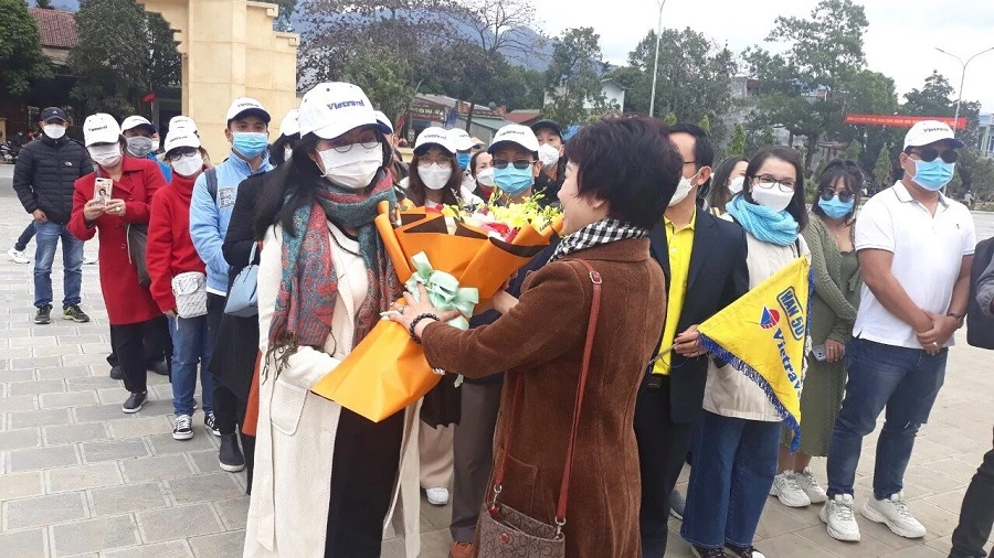 Lãnh đạo Sở Văn hóa thể thao và Du lịch tỉnh Hà Giang trao hoa chúc mừng khách từ TP.HCM du xuân đến Hà Giang mùng 3 Tết. ẢNH: V.THẢO