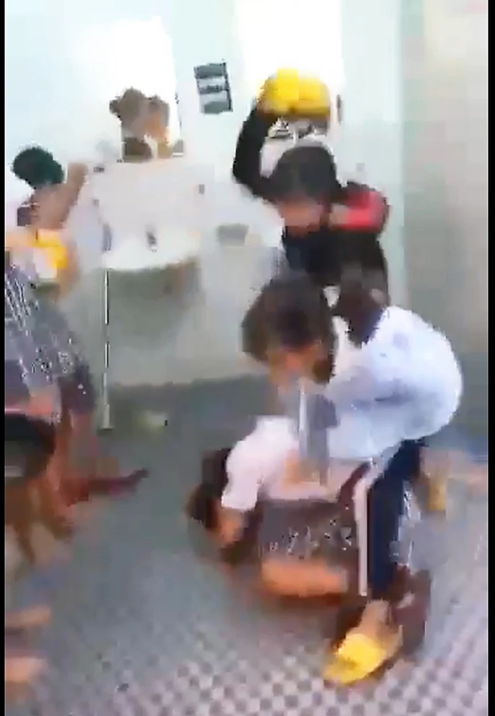 Theo đoạn clip dài 1 phút 46 giây, em M. bị nhóm 5 học sinh lớp 8 xông vào lôi cổ áo, dùng nón bảo hiểm, dép và chân tay đánh vào đầu, vai, lưng. Sau khi đạp ngã em M. xuống nền gạch, nhóm học sinh này tiếp tục lao vào đánh túi bụi.