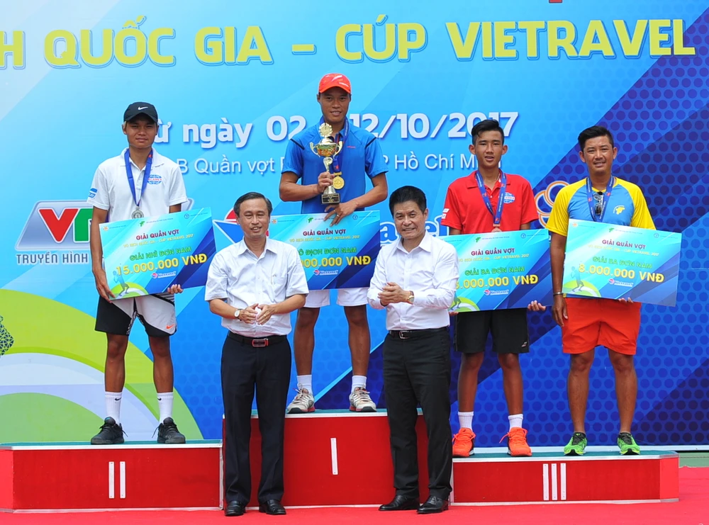 Các tay vợt nhận trao thưởng nội dung đơn nam. Ảnh: THANH THÚY