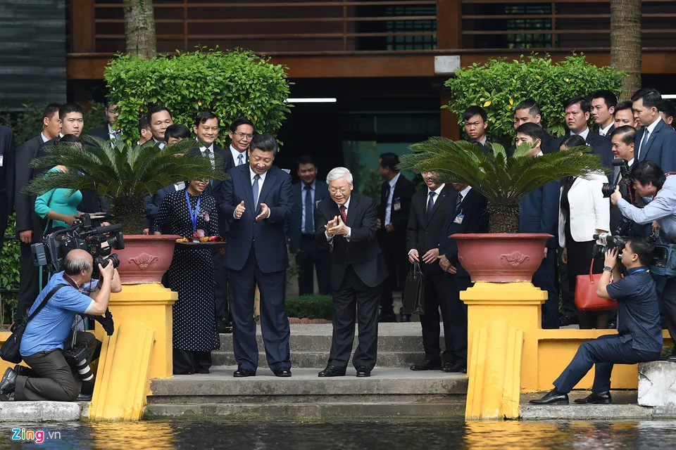 Tổng Bí thư Nguyễn Phú Trọng và Tổng Bí thư, Chủ tịch Trung Quốc Tập Cận Bình cùng đi dạo trong khuôn viên Khu di tích Chủ tịch Hồ Chí Minh vào sáng 13-11. Ảnh: ZING