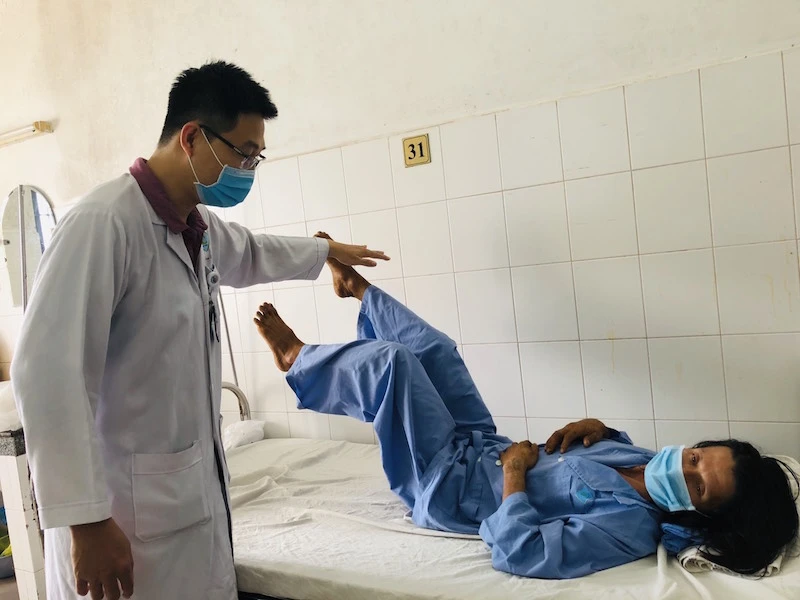 Sau 3 ngày phẫu thuật, bệnh nhân đã cử động được chân bên trái, có thể tự ngồi dậy để tập các động tác vật lý trị liệu hỗ trợ. Ảnh: HẢI DƯƠNG