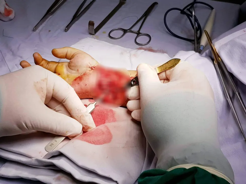 Để cứu lấy đôi bàn tay, êkíp gồm ba phẫu thuật viên và êkíp bác sĩ gây mê đã khẩn cấp phẫu thuật cho bé. Ca phẫu thuật căng thẳng kéo dài suốt hơn năm tiếng đồng hồ. Trong lúc phẫu thuật, các bác sĩ còn phát hiện bé bị đứt bảy cọng gân, đứt dây thần kinh trụ và cả động mạch trụ nên rất khó cầm máu.