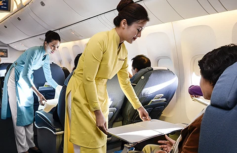 Tiếp viên VNA đang hướng dẫn du khách cách sử dụng bàn ăn. Ảnh: QUANG HUY