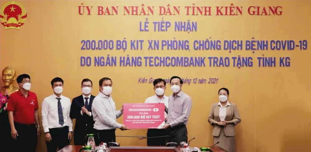 Đại diện lãnh đạo Techcombank trao tặng 200.000 bộ kit test COVID-19 cho Sở Y tế tỉnh Kiên Giang.