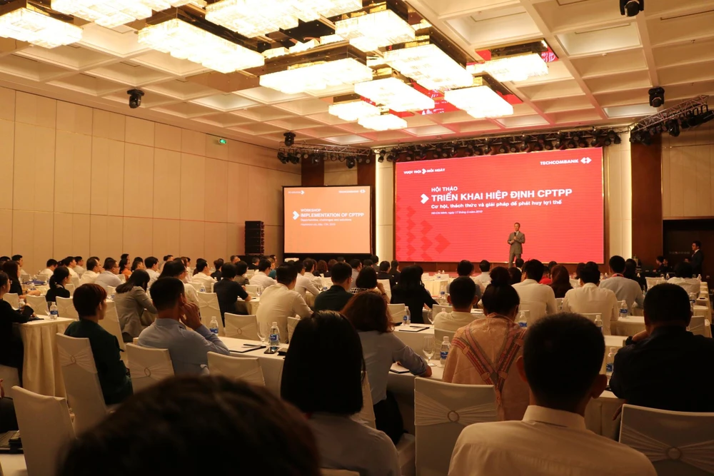 Hội thảo "triển khai hiệp định CPTPP và cuộc chiến thương mại Mỹ- Trung" do Techcombank tổ chức, nhằm tạo diễn đàn để các khách hàng doanh nghiệp kết nối mạng lưới, mở rộng chuỗi giá trị.