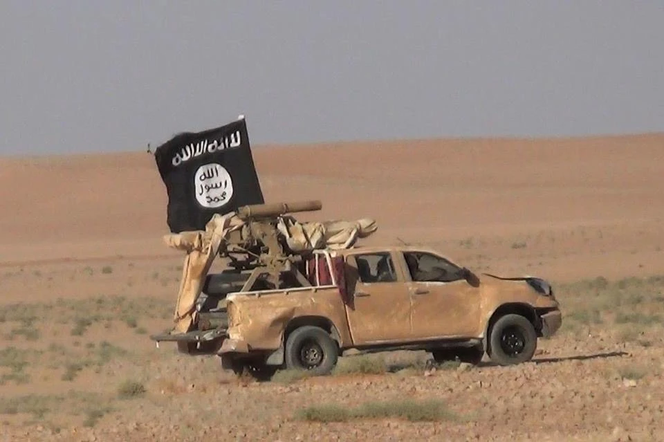 Trong một video truyên truyền của IS công bố hồi tháng 10-2017, các tay súng chở theo một tên lửa chống tăng ở phía sau xe tải nhỏ ở Qaryatain, Syria. Ảnh: PLANET PIX/ZUMA PRESS
