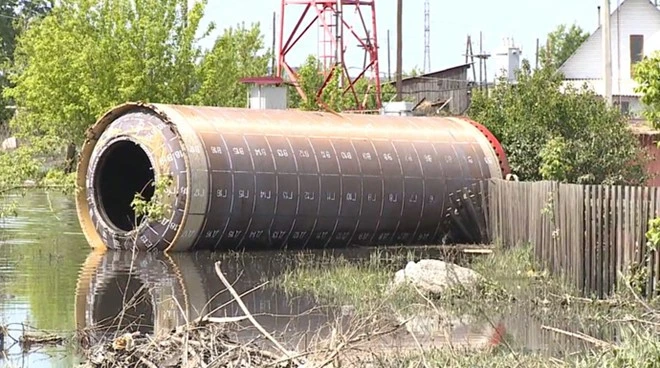 Hãng thông tấn RT hôm qua đưa tin, nước lũ đẩy ống kim loại khổng lồ tới gần nhà của một cảnh sát giao thông địa phương. Gia chủ và những người sống gần đó vô cùng ngạc nhiên và tò mò về nguồn gốc của nó.