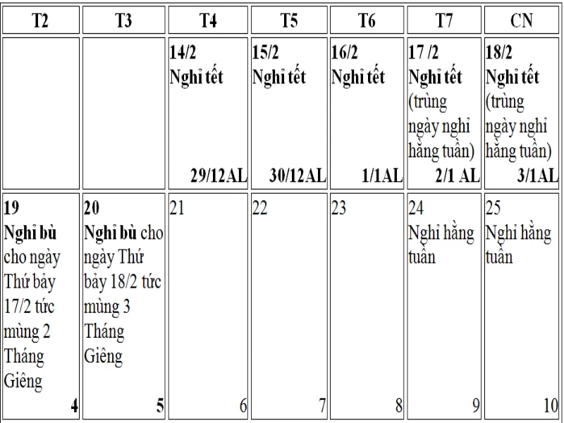 Theo đó, cán bộ, công chức, viên chức, người lao động các cơ quan hành chính, sự nghiệp, tổ chức chính trị, tổ chức chính trị - xã hội được đề xuất nghỉ tết âm lịch từ ngày 14-2-2018 đến hết 20-2-2018 (tức từ 29 tháng chạp năm Đinh Dậu đến hết ngày 5 tháng giêng năm Mậu Tuất).