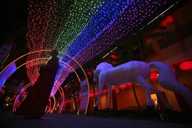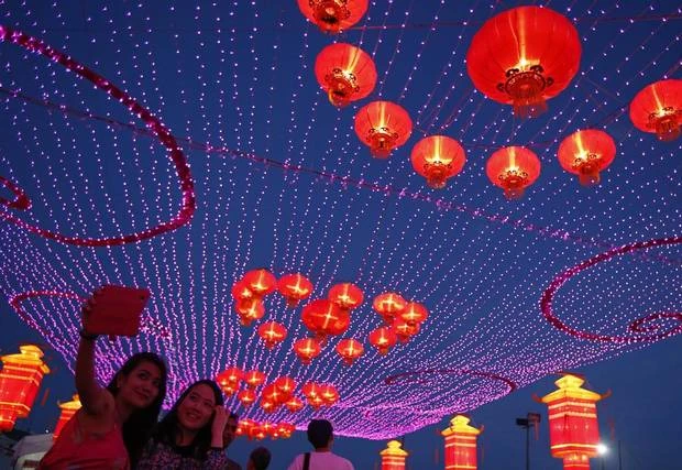 Du khách đi qua cổng trưng bày đèn lồng hoa trong lễ kỷ niệm năm mới tại vịnh Marina, Singapore ngày 29 tháng 1 năm 2014. ( EDGAR SU / REUTERS )