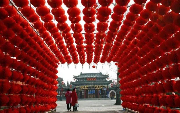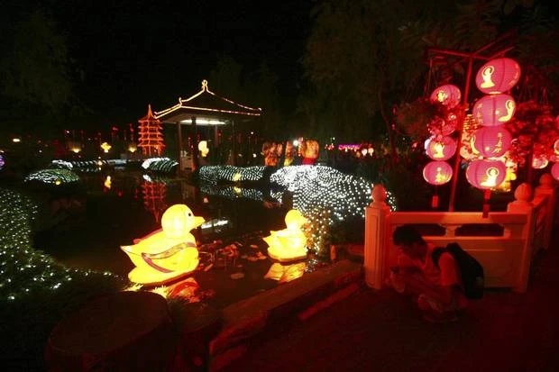 Du khách đi bộ qua khu trang trí đèn lồng đỏ tại công viên Longtan ở Bắc Kinh. Ảnh chụp ngày 29 tháng 01 năm 2014. ( KIM KYUNG-HOON/REUTERS )
