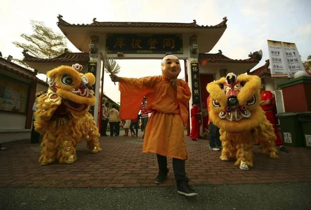 Đoàn người thực hiện điệu múa sư tử bên ngoài một đền thờ trước lễ kỷ niệm năm mới tại Jenjarom, ngoại ô Kuala Lumpur vào ngày 29 tháng 1 năm 2014. ( Samsul NÓI / REUTERS )