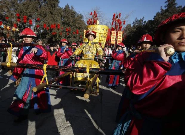 Một nghệ sĩ biểu diễn ăn mặc như hoàng đế triều đại nhà Thanh cưỡi trên kiệu trong lễ khai mạc hội chợ kỷ niệm năm mới tại đền thờ Trái đất, Công viên Ditan, Bắc Kinh. Ảnh chụp ngày 30 tháng một năm 2014. ( KIM KYUNG-HOON/REUTERS )