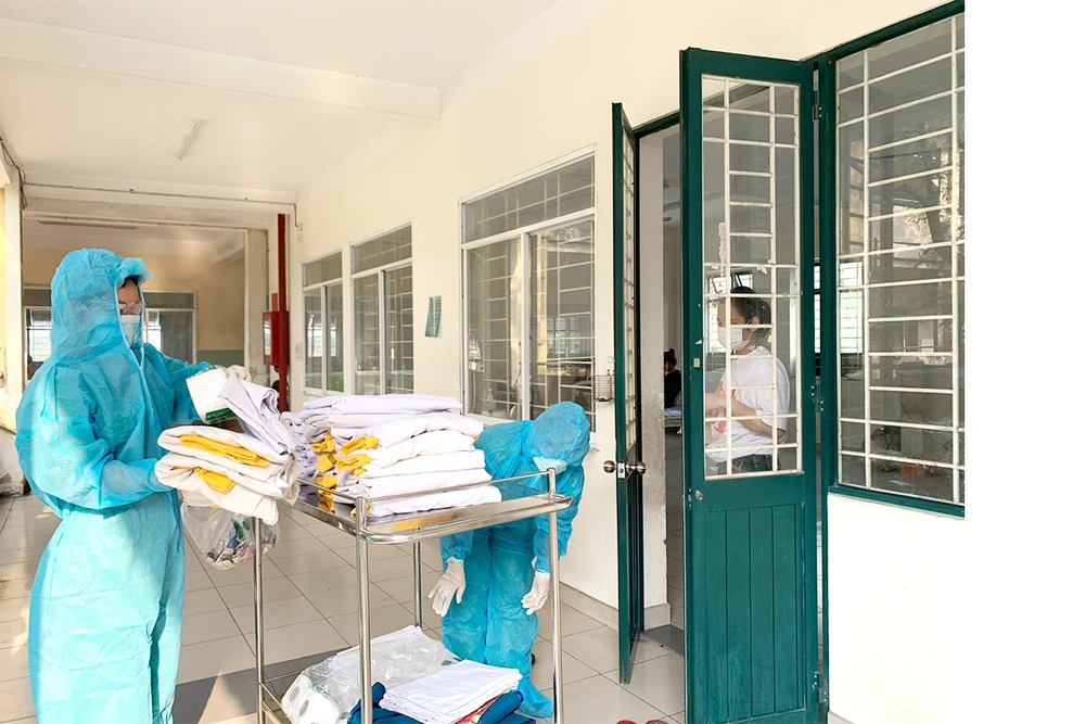 Mỗi ngày, các hộ lý gom quần áo, drap giường, gối, mền, khăn mặt của người cách ly mang đi giặt và phát lại cho người cách ly. Ảnh: HOÀNG LAN