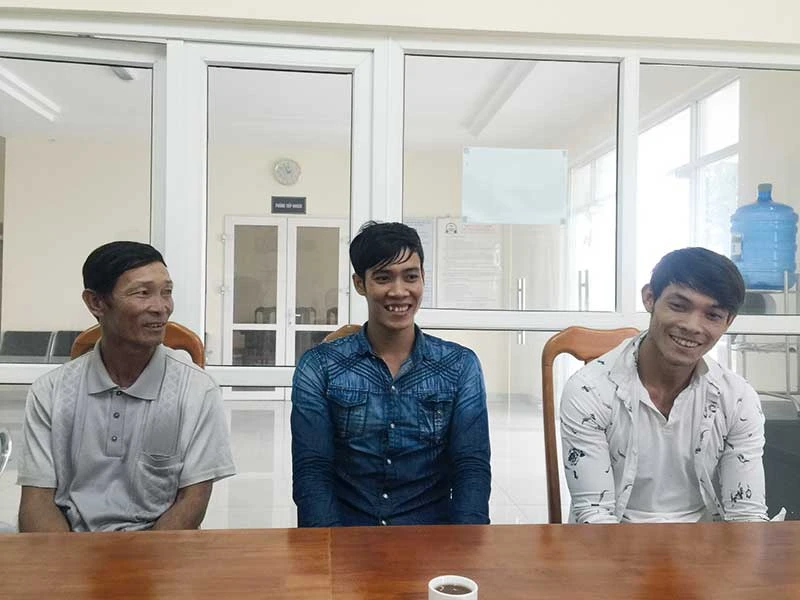 Trần Văn Uống và Ong Văn Sệt cười vui trong ngày nhận quyết định minh oan. Ông Huỳnh (trái) đã tạm thôi lo lắng.