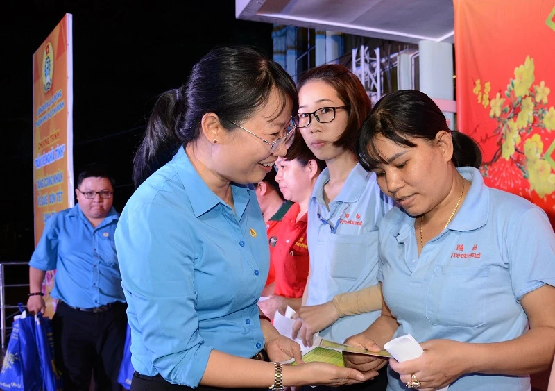 Bà Trần Thị Diệu Thúy, Chủ tịch LĐLĐ TP.HCM trao tặng vé cho công nhân. Ảnh: TRÚC PHƯƠNG