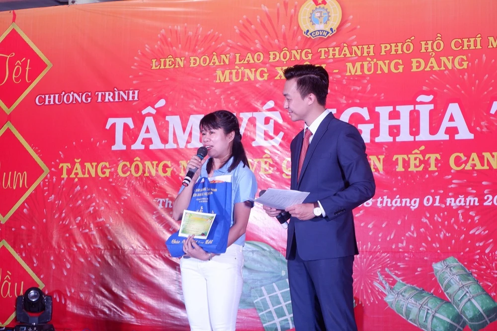 Tối 8-1, tại Nhà thiếu nhi quận Thủ Đức (TP.HCM), chương trình “Tấm vé nghĩa tình” đã trao tặng 1.700 tấm vé xe, vé tàu Tết cho công nhân TP.HCM về quê đón Tết cùng gia đình.