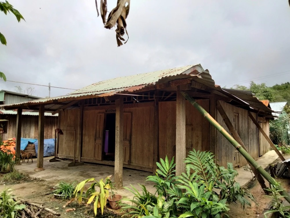 Ngôi nhà gỗ ọp ẹp của gia đình ông Alăng Crơ hiện tại. Ảnh: T.AN