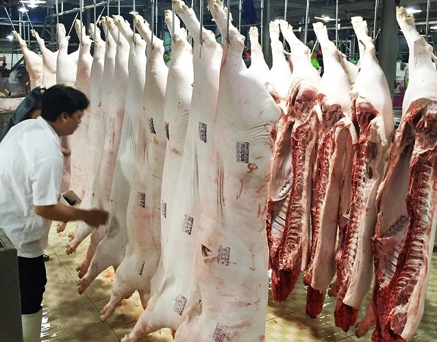 Dây chuyền giết mổ heo VietGAP của Công ty An Hạ. Ảnh: TRẦN NGỌC