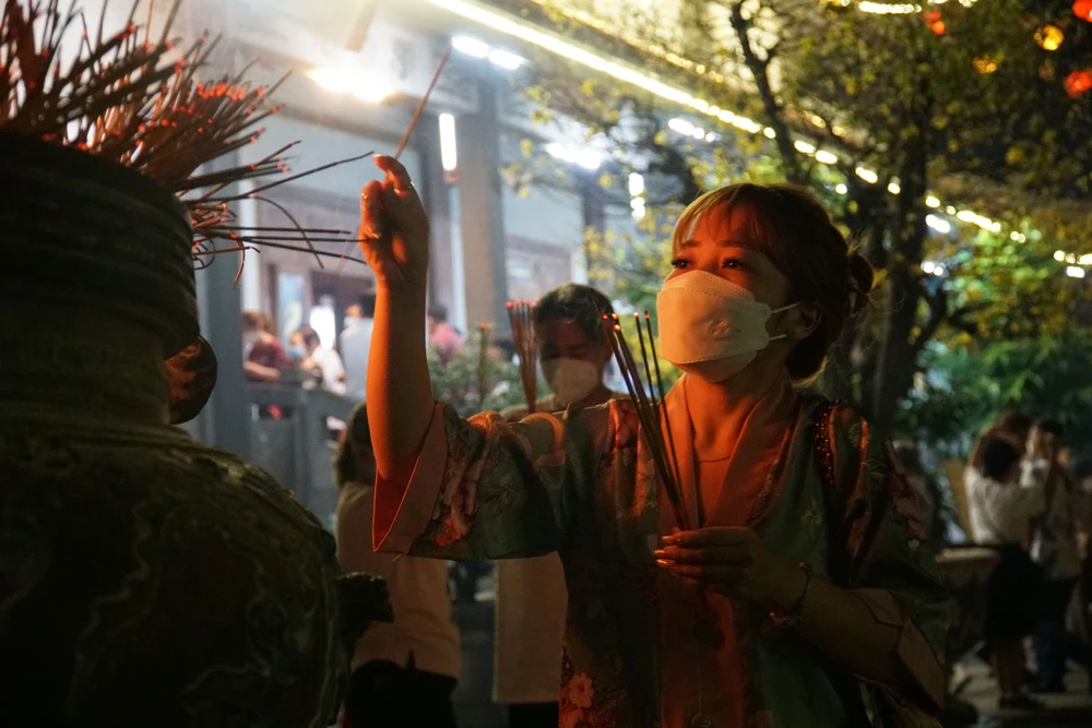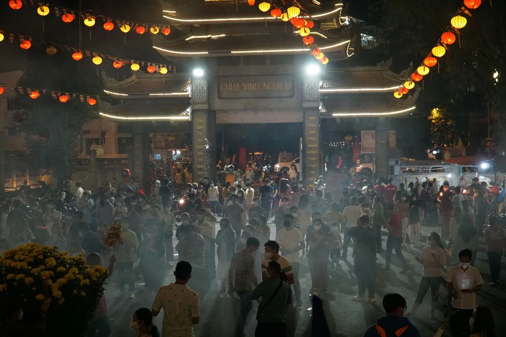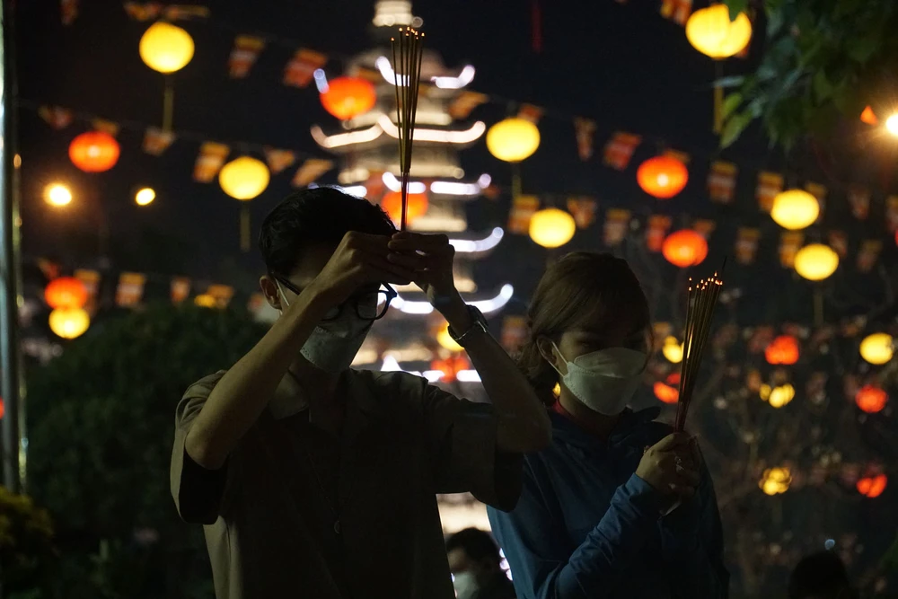 Và ngay sau thời khắc chuyển giao giữa năm cũ và năm mới, nhiều người đã cùng nhau tới chùa thắp hương lễ Phật. Ghi nhận tại Chùa Vĩnh Nghiêm (phường Võ Thị Sáu, quận 3, TP.HCM), đêm giao thừa có rất đông người dân đến đây thắp hương cầu an, chúc phúc cho gia đình và hái lộc đầu năm. Ảnh: BẢO PHƯƠNG