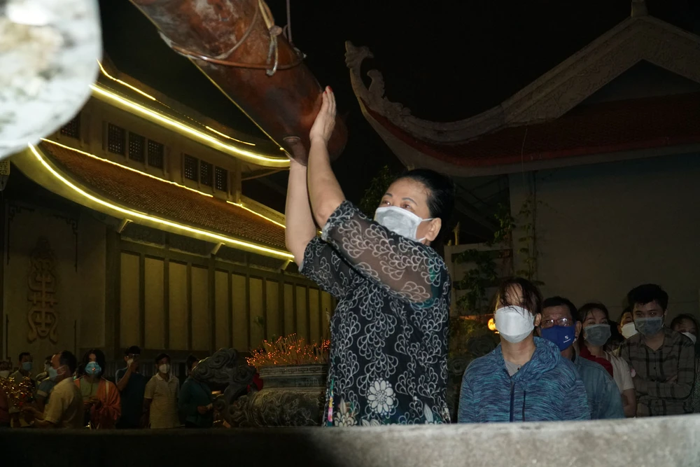 Đêm Giao thừa mọi người tranh thu đến chùa gõ chuông để hái lộc cầu mong bình an cho năm mới. Ảnh: BẢO PHƯƠNG