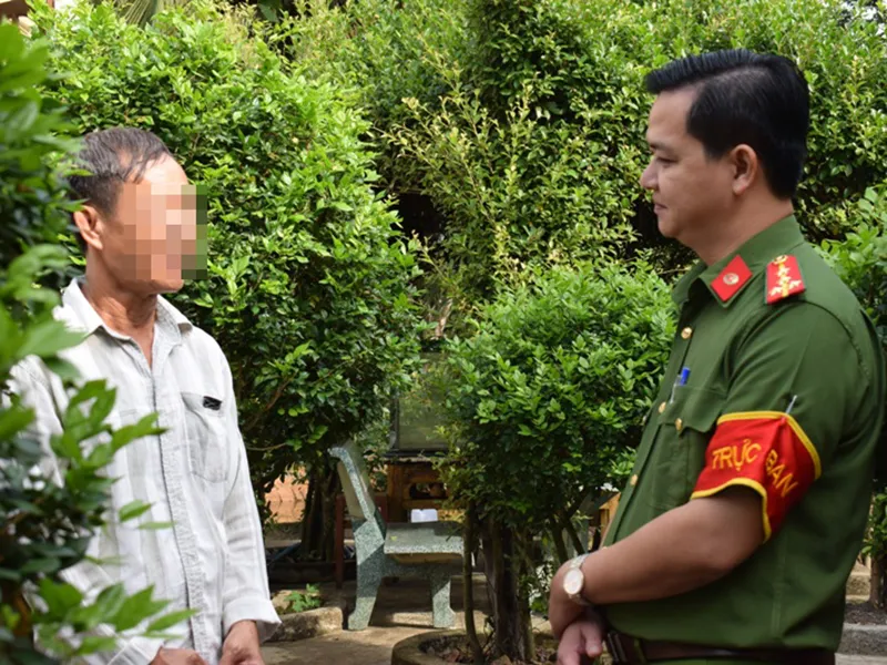 Đại úy Phạm Tuấn Em trò chuyện hỏi thăm phạm nhân. Ảnh: NGUYỄN TRÀ