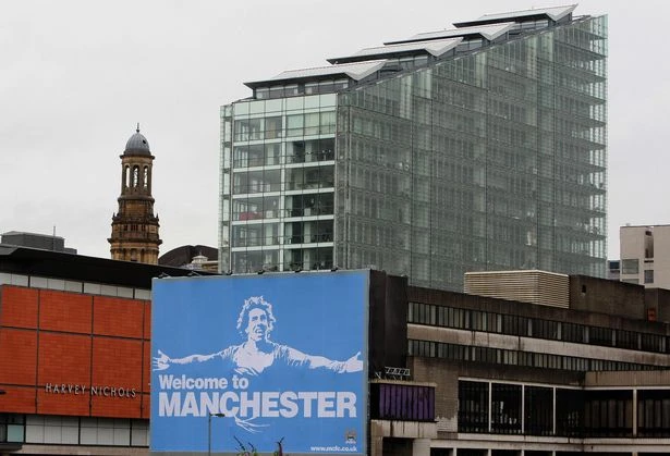Tấm "Áp phích" hình ảnh Tevez và thành Manchester màu xanh. ẢNH: PA