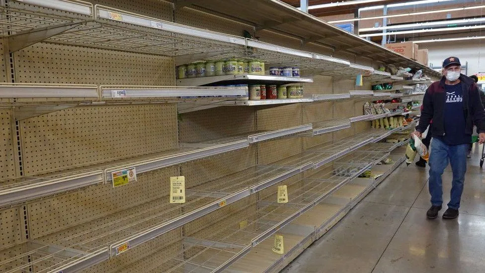 Những kệ hàng, tủ đông vốn đầy tràn sản phẩm cách đây không lâu nhưng giờ hoàn toàn trống trơn tại những cửa hàng, siêu thị ở Dallas, Texas, đài BCC đưa tin.
