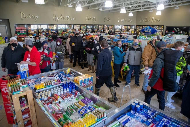 Mặc dù chuỗi cung ứng thực phẩm tại Texas gần như bị tê liệt, song bên ngoài các cửa hàng và siêu thị người dân vẫn đứng xếp hàng dài trong bãi đậu xe phủ đầy tuyết, rùng mình vì lạnh, trong lúc đợi để được vào bên trong.