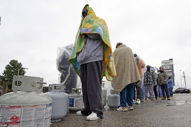 Người dân Texas xếp hàng mua khí đốt trong cơn giá rét. Ảnh: AP