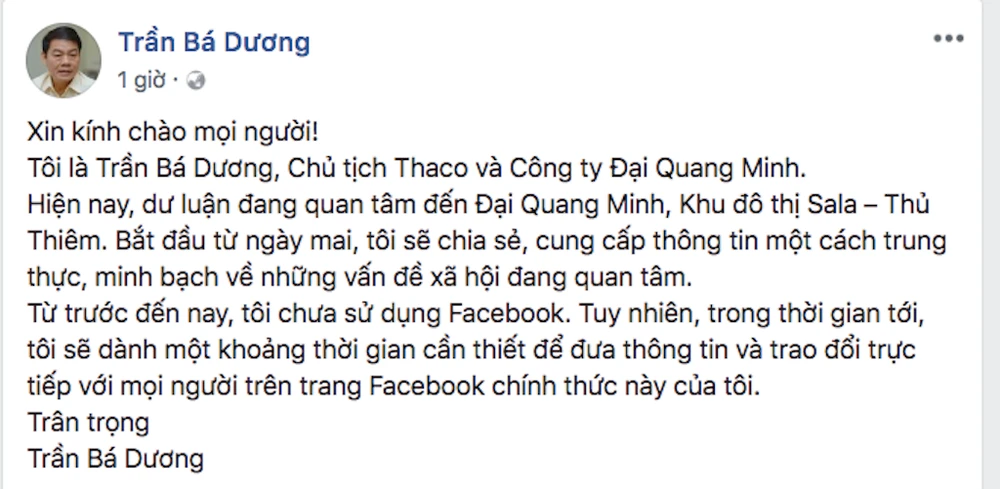 Hiện nay, dư luận đang quan tâm đến Đại Quang Minh, Khu đô thị Sala – Thủ Thiêm. Bắt đầu từ ngày mai, tôi sẽ chia sẻ, cung cấp thông tin một cách trung thực, minh bạch về những vấn đề xã hội đang quan tâm.