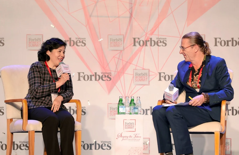 Bà Mai Kiều Liên trò chuyện cùng ông Dominic Scriven, Chủ tịch quỹ đầu tư Dragon Capital trên sân khấu Women Summit 2018 do Forbes Việt Nam tổ chức (Ảnh: Lý Võ Phú Hưng)