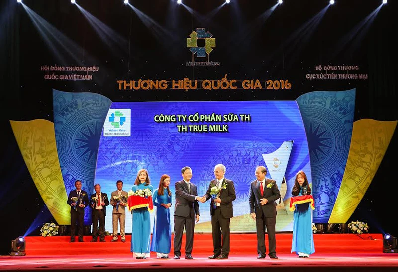 Đại diện TH true MILK- ông Ngô Minh Hải, Phó tổng Giám đốc Tập đoàn TH đã lên nhận biểu trưng Thương hiệu Quốc gia 2016.