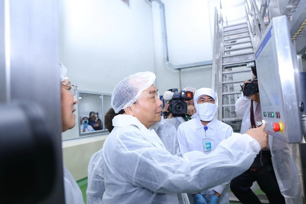 Thủ tướng Nguyễn Xuân Phúc bấm bút vận hành dây chuyền sản xuất nước tinh khiết.